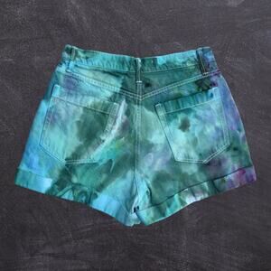 Hand-dyed jean shorts in "jade watercolor," a unique combination of greens and purples. These high-rise, pleated shorts are a perfect modern take on a classic 80's cut. I use procion dyes in my creation for vivid, long lasting colors!