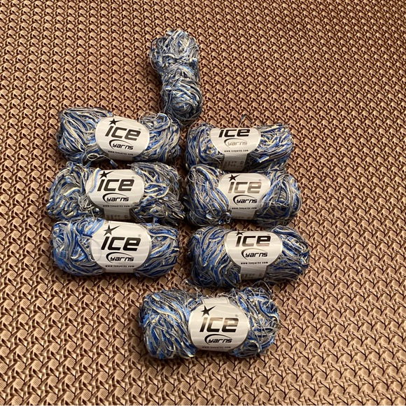 ICE brand loop-style ribbon yarn in shades of blue and white. Soft looped texture for knitting and craft projects. Ideal for scarves, trims, and decorative accents.