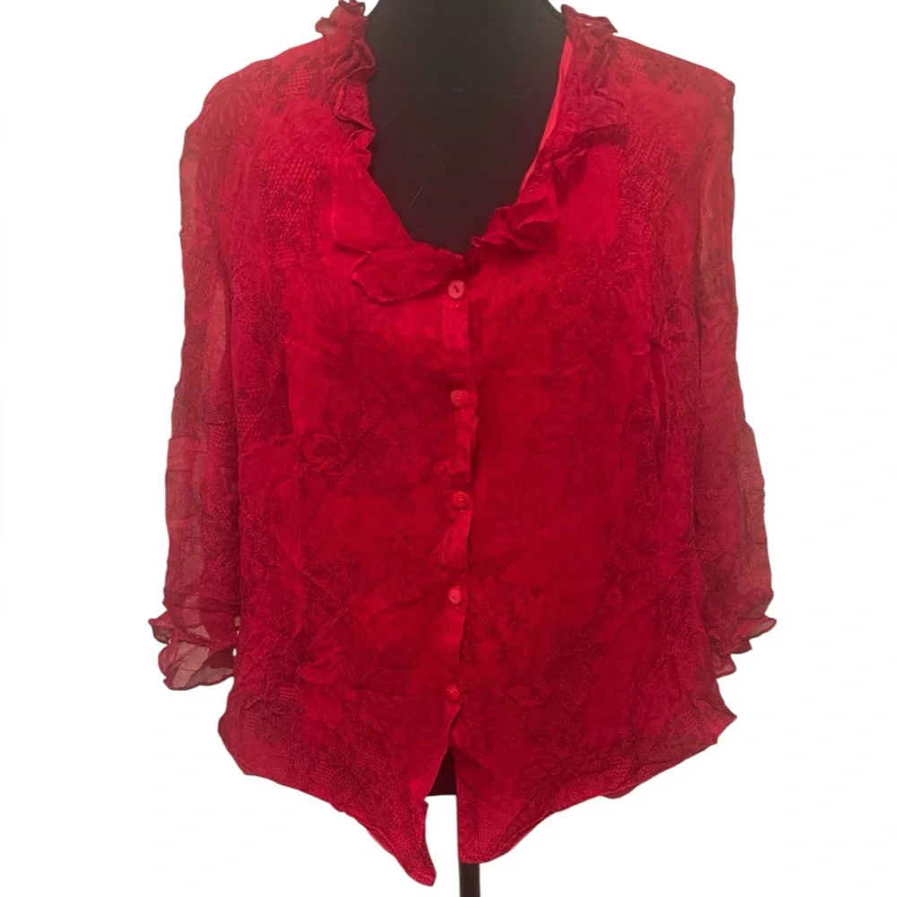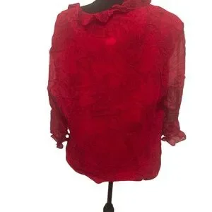 Chic red blouse with ruffled neckline. Lightweight and stylish. Perfect for any occasion.