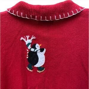 Cute sweater featuring ice skating penguins, embroidered snowflakes, and whipstitched collar. Size Medium by CARLY ST. CLAIRE. Absolutely darling! Good pre-owned condition with mild fading from wash wear. Please see measurements in photos to ensure a proper fit as I adhere to a no returns policy. Thank you!