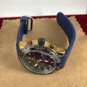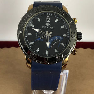 Mens Ice Star Quartz Wrist Watch Navy Silicone Band Gold and Gun Metal Case Stainless Steel Back Water Resistant to size 10 and 1.925 case diameter new battery