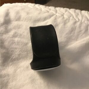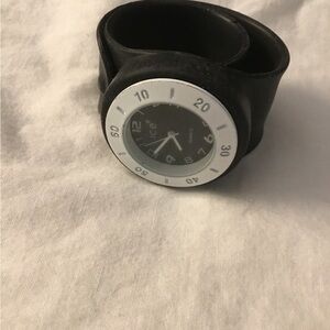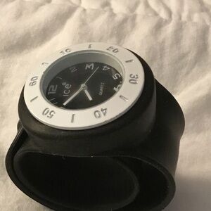 Black watch with white trim. Adjustable slap band. Works beautifully. Like new condition! Smoke-free home. (just one watch)