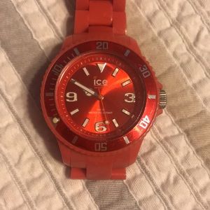 Water resistant Ice watch. Brand new battery. Fits larger wrist and measures 10” around. Links can be removed by jeweler. Great beach watch! Good used condition. Has 2nd hand and keeps time accurately. Salmon / coral color but more pink than orange.
