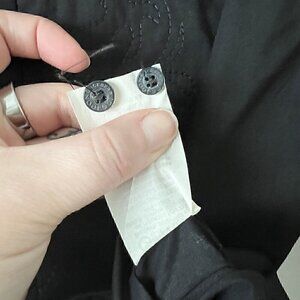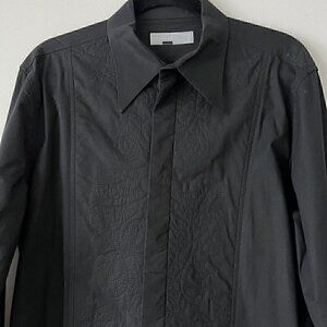 Black cotton blend long sleeve button down with collar. The buttons down the front are concealed with a fabric overlay. The front of the shirt has a flame pattern embroidered in black thread. Dark mother of pearl branded buttons (two extra on the material tag on the inside) Good condition. Please see pictures for material content and details.