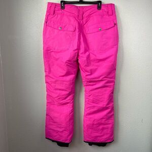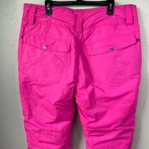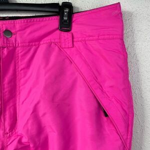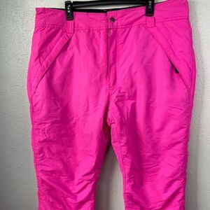 Classic pair of snow pants featuring a hot pink color. The measure 20 inches at the waist lying flat and have a 31 inch inseam.