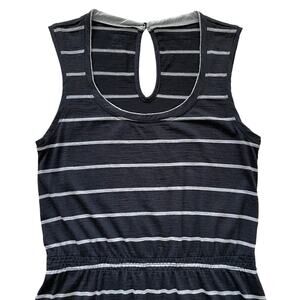 Icebreaker Crush sleeveless dress size Small made with 100% merino wool in a flattering black and grey stripe pattern. Sleeveless with keyhole button back, elastic waistband, and a high low hemline. Purchased new and only worn a few times. Great condition with no flaws of note. Perfect dress for travel or hot days!
