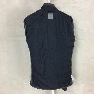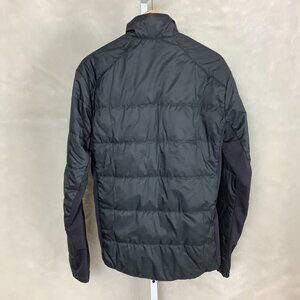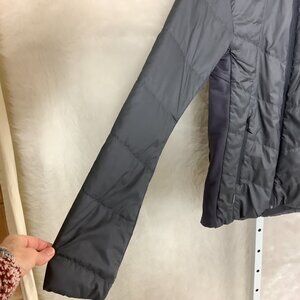 This is a grey, long sleeve, full zip, high neck, wool blend insulation, polyester outer, puffer jacket from Icebreaker. Has stretchy side panels, zipper pockets. 100% polyester outer; polyester, wool, elastane side panels; wool, polyactide insulation and 100% wool lining. A pull on the front, mark on the sleeve and front, pictured. Winter, fall, outdoor, hiking.