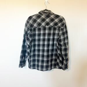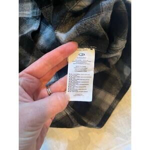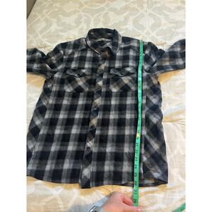 Size large (see pictures. May have shrunk ever so slightly. Fabric doesn’t lay totally flat between buttons
