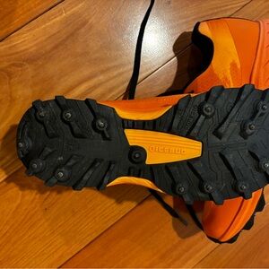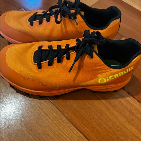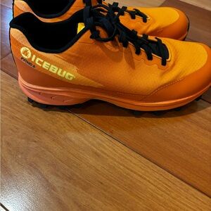 Womens size 8 Icebug trail running shoes. Water resistant mesh exterior. BUGrip soles with 16 studs for traction on muddy trails and icy roads. These sneakers have no insoles to accommodate runner’s preference.