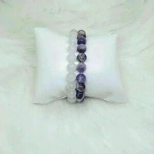 These Iced Taro Duo Beaded Bracelets come in a bundle of two, featuring a stylish iced white bracelet and a stunning taro marble purple and white bracelet. Both bracelets are made with 8mm beads and have elasticity to fit most wrist sizes. Elevate your accessory game with this chic and versatile bundle.
