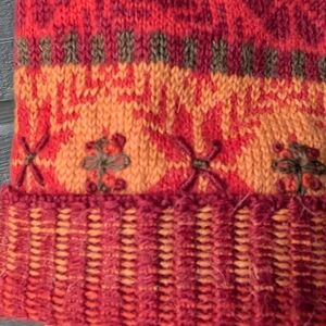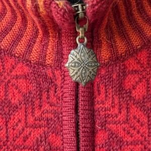 Excellent preowned condition red intarsia knit zip front alpaca wool cardigan from Icelandic Designs. Shades of red, orange and marigold. Floral pattern. Fully lined with luxurious satin. 2 front zipper pockets (also lined in satin). Cuffed sleeves. Clean. No flaws.
