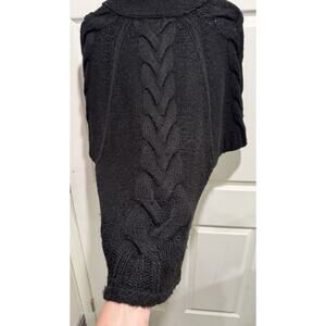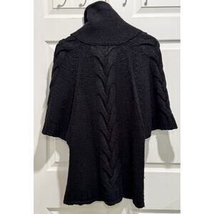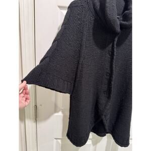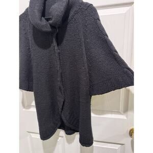 This sweater has minor pilling from wear; large snap buttons in the front; dolman sleeves.