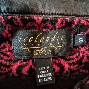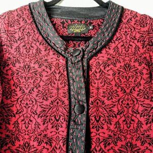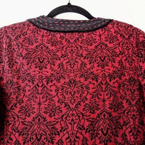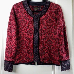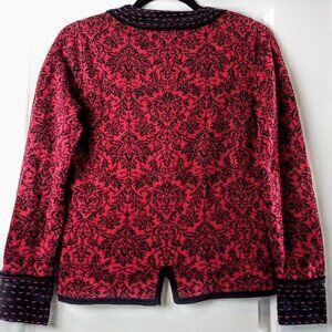 Super-soft pure cashmere and silk long-sleeve cardigan sweater from Icelandic Design in deep, rich red and black pattern with embroidered trim along the neckline, front and cuffs, and black fabric-covered buttons.
