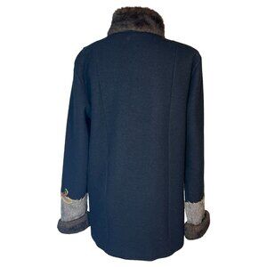 Icelandic Design Embroidered Wool Coat Jacket Faux Fur Trim Size L Black Lined
