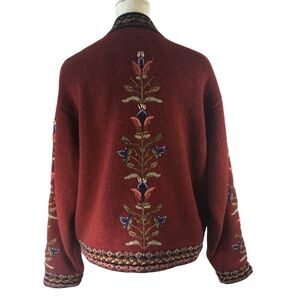 Icelandic Design Wool Zip Cardigan Women L Red and Embroidery Accents