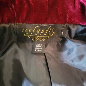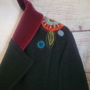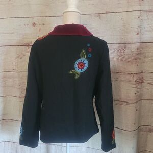 Black wool blazer with burgundy velvet collar and multicolored floral embroidery. Fully lined with 3 button closure. In good condition.