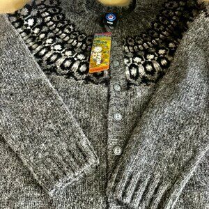The Icelandic lopi wool, 100% Icelandic wool, is naturally repellent and breathable, which makes Fróði wool sweater a perfect companion for any outdoors adventure as well as keeping you warm indoors. The beautiful Icelandic pattern and qualities of the wool jumper look good when paired with any other outdoor clothing. Icelandic lopi wool comes from free roaming Icelandic sheep, which were introduced to Iceland with the first settlers. This wool sweater for men features buttons in the front of the sweater and is very warm. It's almost Christmas time and what a great Christmas gift! Please see all photos- Measures 22.5 " pit to pit and just over 27" in length.