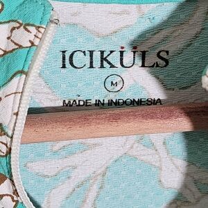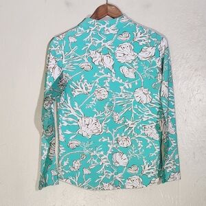 Stylish teal blouse with a white seashell print. Perfect for a beach-inspired look.