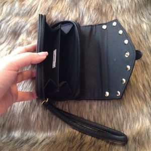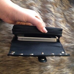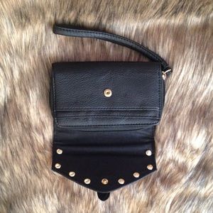 •Icing black faux leather wristlet with gold studs/accents. •Snap closure. •Two outer pockets for cards or money, and two bigger pockets inside the zipper. •Also a space to fit your iPhone! Holds up to the 5c model. •This has never been used. •It's perfect for using on a girls night out when you don't want to carry around a huge purse! •Selling for $10, or best offer. •Thanks for looking! 🌸