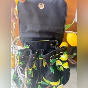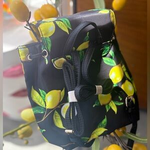 Stylish black backpack with vibrant lemon print. Features a front zipper pocket. Perfect for casual outings.