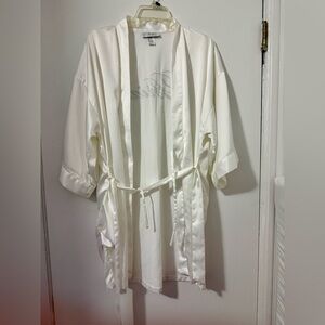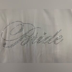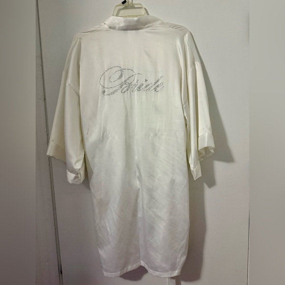 Silky white robe with bling writing. Perfect for a bride to get ready in on her wedding day!