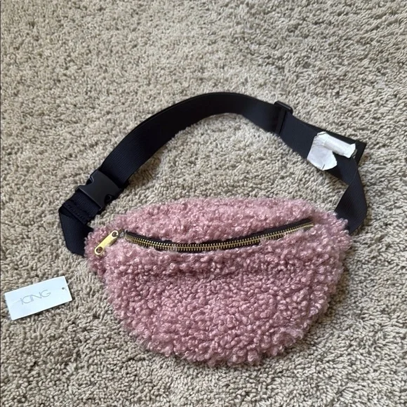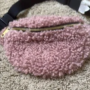 Stylish pink fuzzy belt bag. Features a secure zip closure. Adjustable black strap for comfort. New and never used , pouch is 10” wide and about 6” in height.