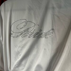 Luxurious white kimono robe with a silky finish. Says bride on the back Perfect for lounging or as a stylish cover-up.