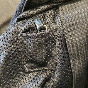 Inside zip pocket with a Saint Christopher medallion and pouch for it