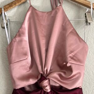 Lulus Icon Update Burgundy Color Block Knotted Halter Midi Dress is the 'fit that will have you the envy of every party! Sleek woven satin shapes slender spaghetti straps that support a rose-toned bodice with flattering bust darts and cutouts at the waist. A knotted detail joins the bodice to a burgundy A-line skirt that falls to a twirl-ready midi hem, for a perfectly chic color block effect. Hidden zipper/clasp at back.