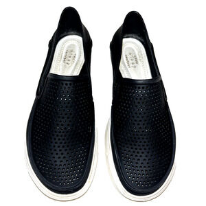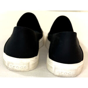 Step up your child's shoe game with these comfortable and stylish slip-on shoes from Crocs. These unisex shoes feature a low top shoe shaft style and a solid pattern, making them versatile for any casual occasion. The slip-on closure and standard shoe width provide easy wear and a secure fit for active kids on the go. The flat heel style and rubber outsole make these shoes perfect for the beach, pool, and water. These shoes come in black and are available in youth size 10-11. With the iconic Crocs comfort, your child will love wearing these shoes all summer, fall, and spring.