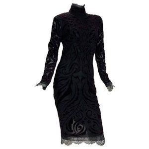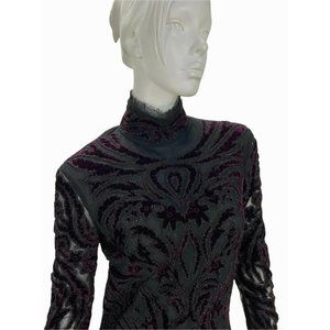 Bordeaux velvet and beading embroidery black sheer chiffon with lace and eyelash-fringe trim.