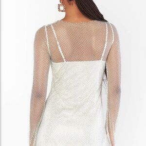 This elegant white dress features a stunning mesh overlay, perfect for any special occasion. The intricate design adds a touch of sophistication and style.