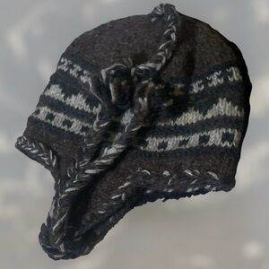 Iconic Wool Ear Flap Warm Winter Hat Made in Nepal OS Brown & Grey Ties & Tassel
