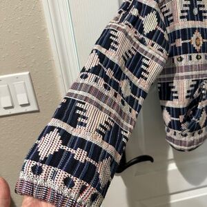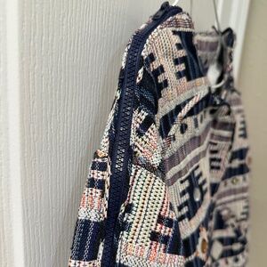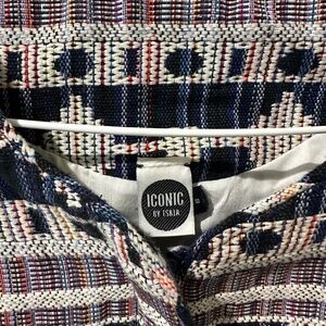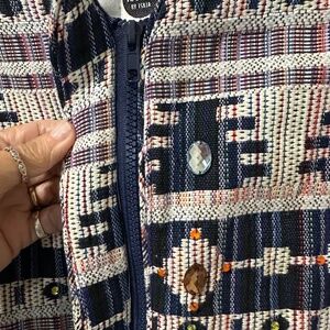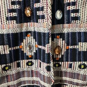 RARE Iconic by Iskia Embellished Jeweled Jacquard Tapestry Jacket. Southwestern Aztec Indie Print in cream black navy blue green orange. Pockets. Zipper shoulders. Elastic cuffs and waist. Lined. 100% cotton.