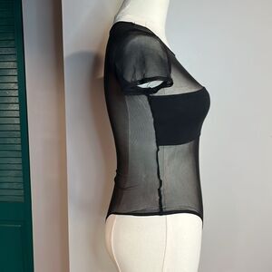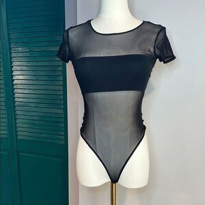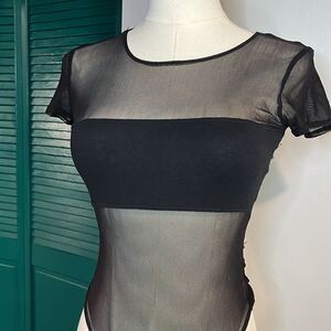 Elevate your style with this chic black sheer bodysuit. Perfect for layering or wearing on its own for a bold look.