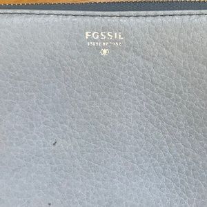 Light blue wristlet clutch by Fossil. Slightly worn with one stain on the front top right corner, inside is like new.