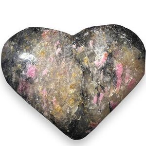 An icy Rhodonite crystal heart carving shimmers with soft pink and black hues, radiating a soothing energy. Known for emotional healing, it fosters love, compassion, and forgiveness, balancing the heart chakra. This crystal dispels anxiety and nurtures inner peace, promoting emotional clarity and resilience.