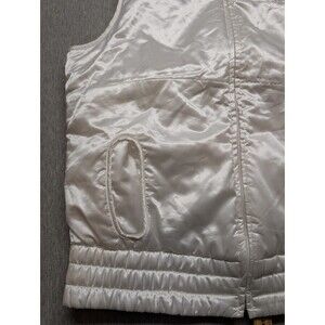 The product is a classic white satin puffer vest in women's XL size, featuring a Nike zipper closure and accents. It is perfect for casual occasions, with a sleeveless design ideal for fall and spring seasons. The vest is adorned with Boise State Football character, making it a stylish varsity jacket perfect for school-themed events. Made with polyester outer shell and lining material, this mid-length vest is a must-have for fans of Boise State Football.