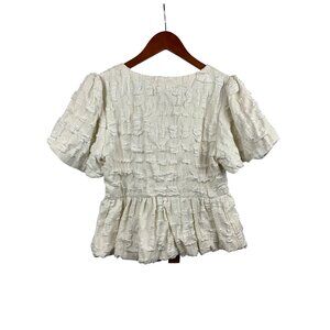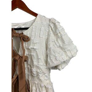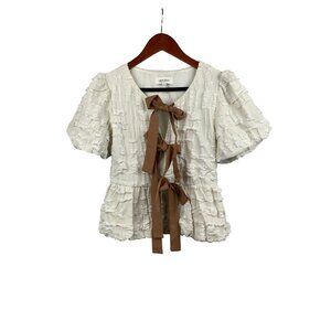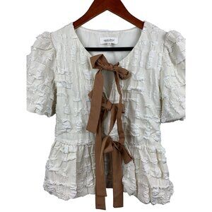 A delicately crafted blouse that marries vintage-inspired elegance with modern design sensibilities. The intricate textured fabric creates a soft, dimensional effect, while the strategically placed brown bows add a touch of sophisticated contrast. Designed for the woman who appreciates nuanced details and understated refinement.