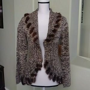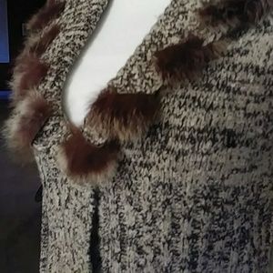 Lovely new sweater with a defect. There is a tiny repairable hole under the collar near button..Not visible unless you peek under collar. See photos. Color is brown/beige with bits of faux fur along collar and bottom. Size M.