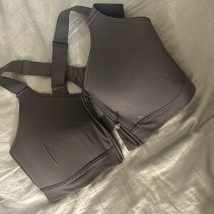 Charcoal activewear top by Ideology. Designed for comfort and style. This is a sports bra that features adjustable straps that crisscross in the back. The closure of the sports bra is located in the front with a zipper. Nice soft stretchy material.