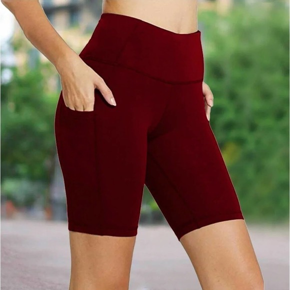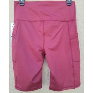 These Ideology biker shorts are new with tags and come in a red pear color. They are a size medium and feature a high rise for enhanced coverage, as well as a convenient side phone pocket.