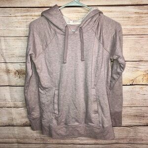 Ideology pullover hoodie in 'shimmer pink'. Attached hood with drawstring; long sleeves with thumbholes; on-seam pockets at front. In excellent condition, no stains, rips, etc. Polyester/rayon/spandex; faux fur: polyester