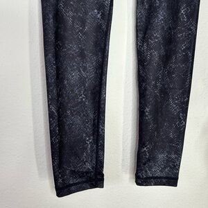 An adorable pair of workout leggings detailed with a snake skin print. Very stretchy with a little shine to them. A mesh accent on the side of each leg