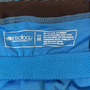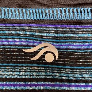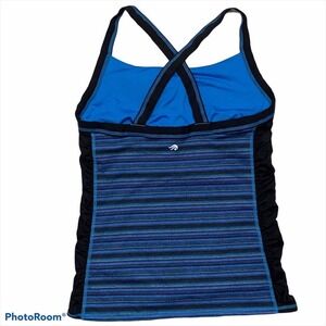 Tank style blue/purple/black fine stripes front and back with solid black sides. Criss-cross straps, built in shelf bra. Sporty with great support. Pair with your favorite swim bottoms!