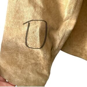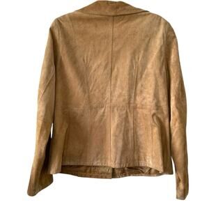 Elevate your outerwear with this timeless Ideology Woman suede blazer in a rich camel tan hue. Crafted from 100% genuine leather with a soft acetate lining, this jacket features a structured silhouette with a notched lapel collar, button front closure, and two front patch pockets with stitched detailing. The Western-inspired seams and subtly gathered waist create a flattering fit with a touch of Boho flair.