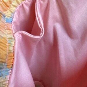Waist is elastic partially in the front and all around the back. Has a liner panty inside and a small pocket inside the waistline for money or a key. Very pretty colors and nice lightweight fabric. NWT.