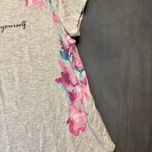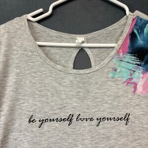 Ideology graphic tee, be yourself love yourself shirt, floral print t-shirt, women’s XXL activewear top, heather gray graphic shirt, keyhole back tee, casual lounge top, inspirational quote shirt, floral athleisure shirt, comfy stretch tee, workout casual top, motivational t-shirt, yoga lifestyle shirt, plus size Ideology top, trendy floral graphic tee