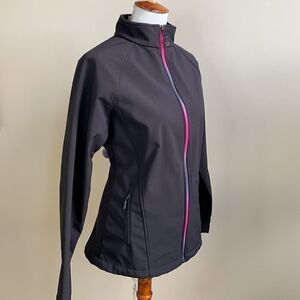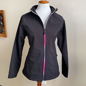 Black, nylon jacket with zipped pockets on each hip and colorful zipper down the center. This jacket is in excellent condition. Perfect for outdoor activities like hiking or walking. Lightweight but warm enough for the Fall & Spring.