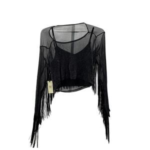 Brand new with tags Idyllwind by Miranda Lambert black mesh long sleeve top with silver metallic fringe and layered tank cami. Size XS. The ultimate fringe piece for Burning Man, rodeo nights, or country concerts. Sheer sleeves and metallic movement add drama under desert sunsets or disco lights. Layer over a bodysuit or bralette for a western glam look.